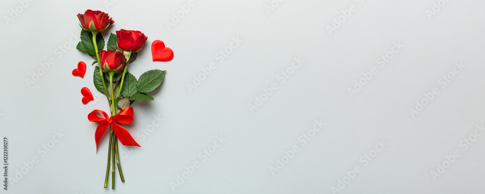 Valentine day composition with rose flower and red heart on table. Top view, flat lay, copy space Holiday concept