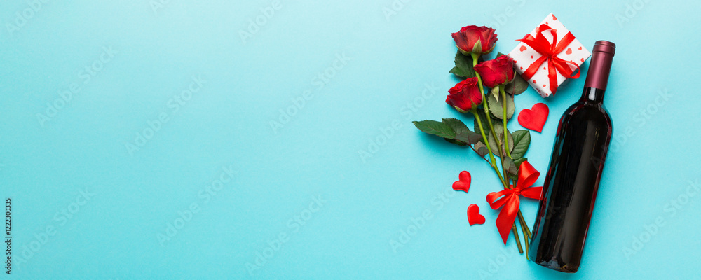 Valentine's day composition with red wine, rose flower and gift box on table. Top view, flat lay. Holiday concept