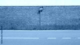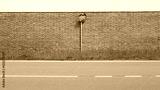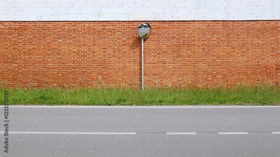 Traffic convex mirror on a pole with brick wall on behind. Strip of grass and road in front. Background for copy space.