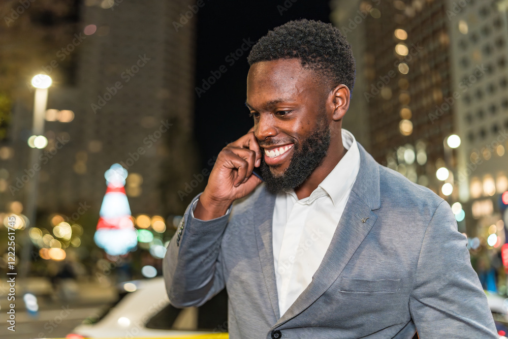 Smiling businessman talking on mobile phone in city at night
