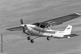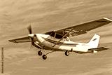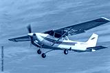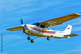 White single engine, high wing aircraft with red and blue stripes flying against a cloudy blue sky