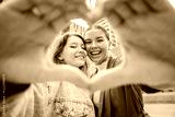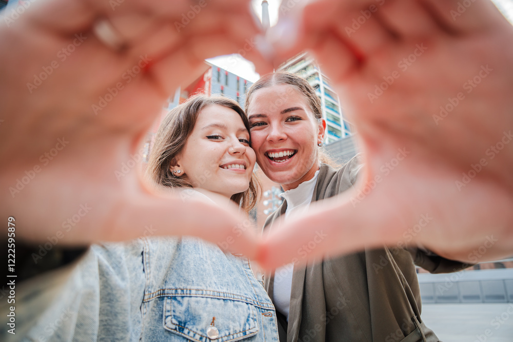 Two cheerful young women posing together, creating a heart shape with their hands, symbolizing friendship, happiness, and love in an urban outdoor setting, sharing joy and positive emotions