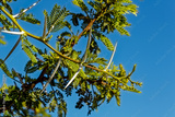 Extremely sharp thorns and leaves on acacia tree against a dark blue sky in summer in the Western Cape, South Africa
