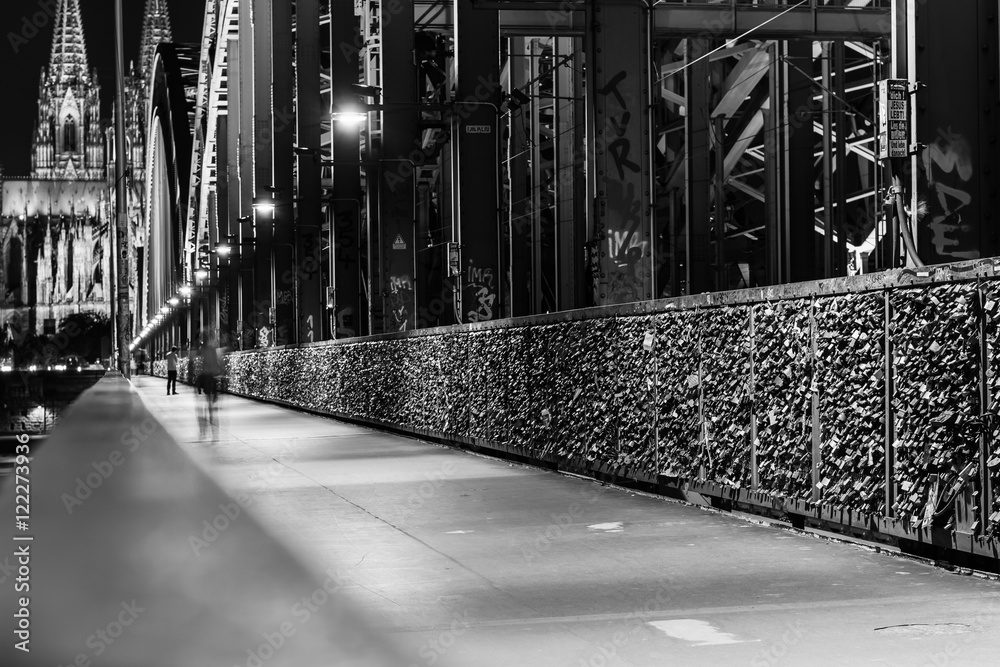 Cologne Cathedral from the Hohenzollern Bridge in Cologne Germany in black and white