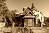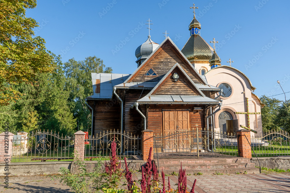 Ukrainian church in the village of Vyhoda. Ukrainian prayer house. Wooden modern architecture. Street kirk