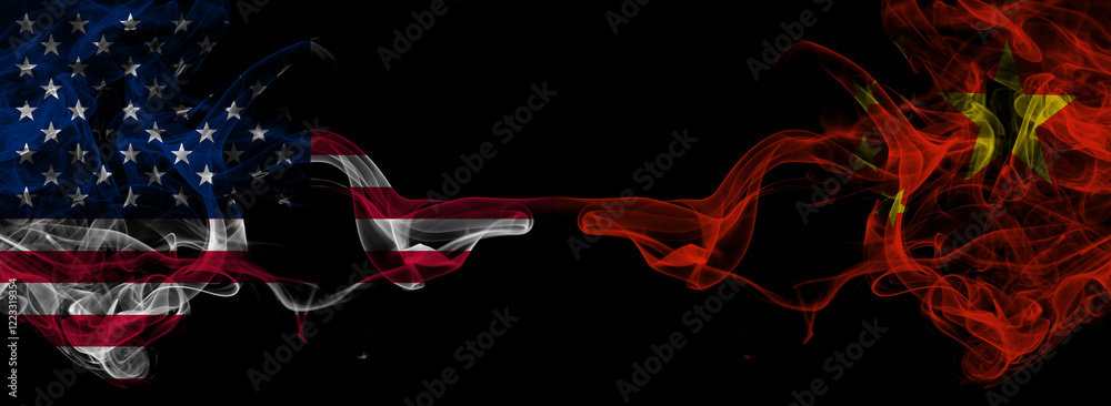 American and Chinese flags in smoke shape on black background. Concept of conflict war and customs duty. America VS China metaphor. Dollar Yuan exchange currency and international commercial tension.
