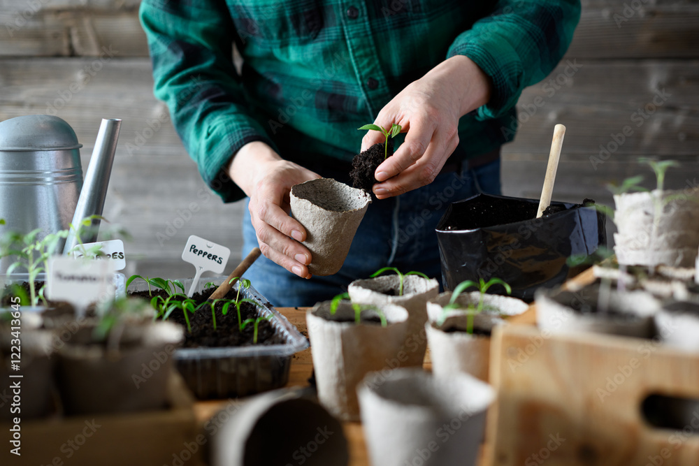 Vegetable gardener transplants tomato and pepper seedlings into peat cups. Preparing plants for growing in open ground. Home gardening concept