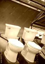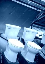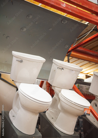 Close-up brand-new toilet bowls on display at large hardware home improvement store in Dallas, Texas, wide selection of elongated, round, one-piece or two-piece toilets ceramics assortment