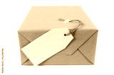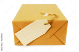 One single small mail package parcel with label or gift tag wrapped brown paper tied with string isolated on white background photo