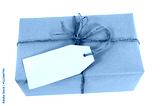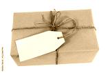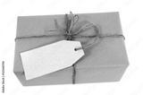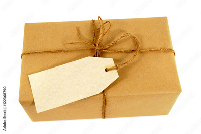 One single small mail package parcel with label or gift tag wrapped brown paper tied with string isolated on white background photo