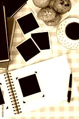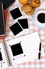 Photo album on a desk or table with polaroid style photo print frame and afternnon tea holiday vacation wedding memories
