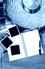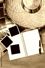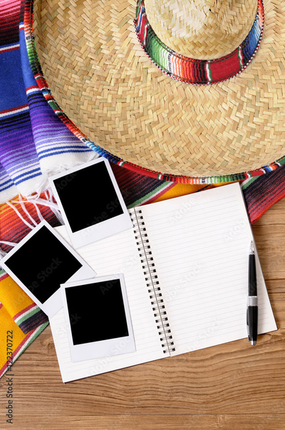 Photo album or notebook scrapbook with several polaroid style photo print frame on a mexico background with sombrero and traditional serape rug or blanket mexican holiday vacation memories