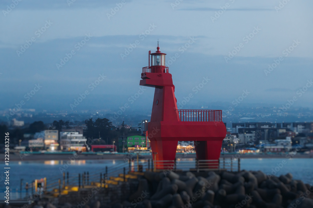 Iho Tewoo Horse Lighthouses on Iho Tewoo beach, with two horse-shaped lighthouses, white horse lighthouse and red horse lighthouse, Jeju-do, Jeju island, Jeju-si, South Korea