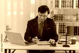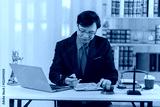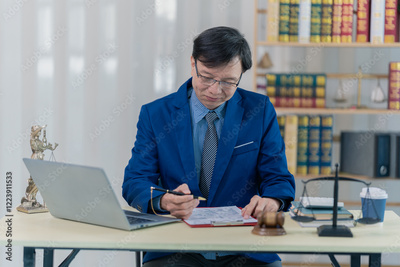Lawyer, judge in suit with legal documents, advice and justice, working with laptop and hammer and scales on table, online work concept