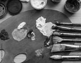 artist's workshop. Easel with brushes and tubes of paint