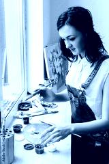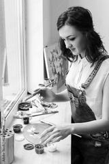 close-up dark-haired artist holding a brush in his hand and mixes paints molber