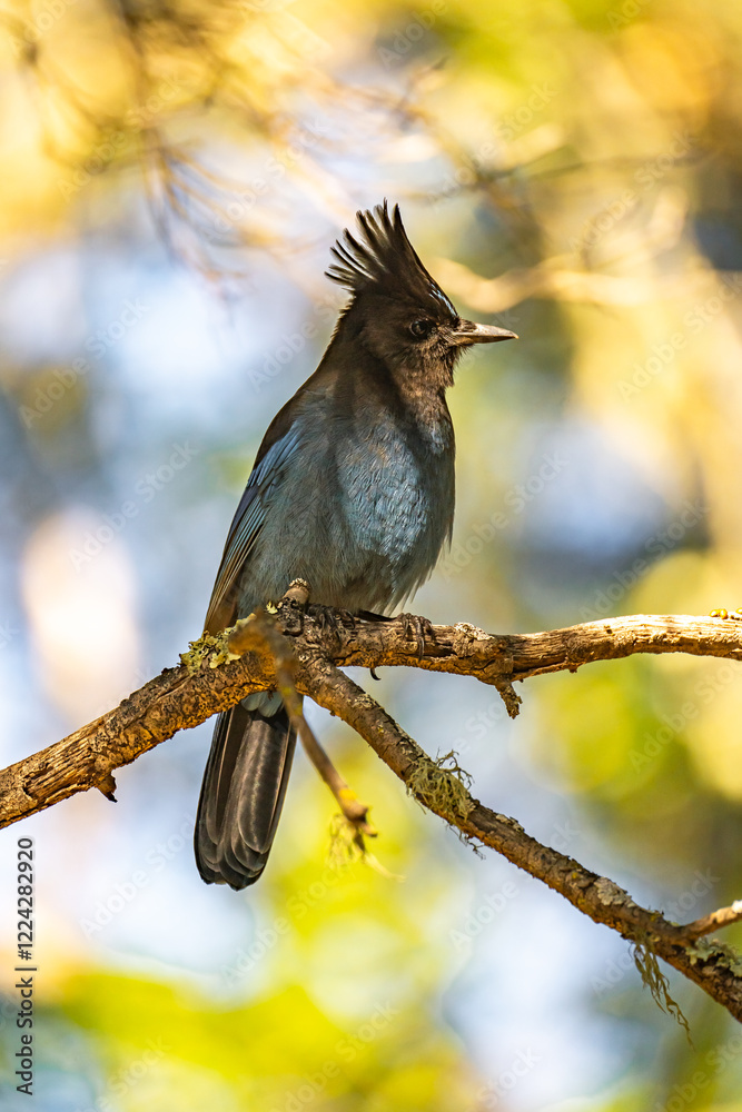 Steller's jay (Cyanocitta stelleri) sits on a branch.