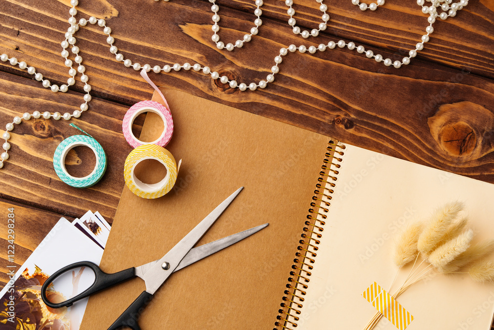 Crafting and creativity come alive with scissors, washi tape, and decorative supplies on a wooden table