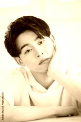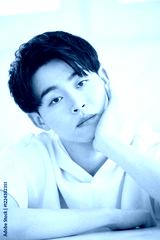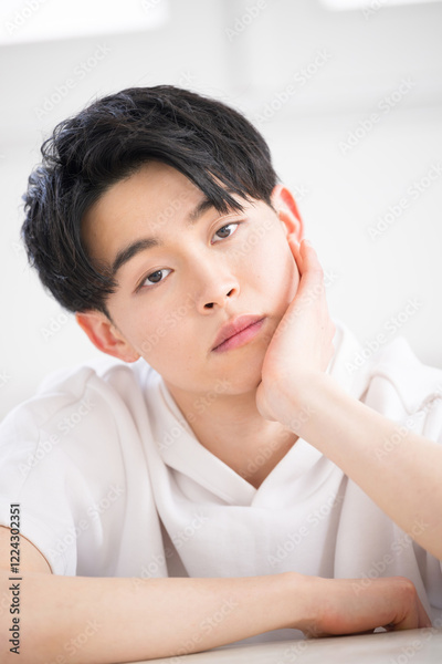 Beauty and beauty image of a man in his 20s in a distressed pose, such as thinking with his hand on his chin, cheekbones, etc. Close-up looking at the camera Vertical