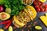 Mexican food - delicious taco shells with ground beef and home made salsa