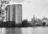 a lake on the background of high-rise buildings and churches at sunset. Ukraine, Kiev, Lake Telbin