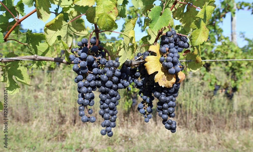 Ripe Cabernet Franc grapes hanging on vine under the sunlight in september.
