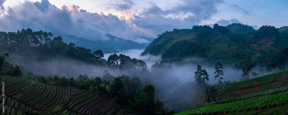 Panoramic view of sea mist over strawberry fields at Doi Ang Khang, a breathtaking serene escape