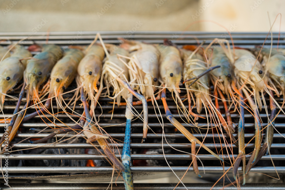 Prawns or shrimp grilled on charcoal stove. Shrimp grilled bbq seafood on stove. Close up river prawn charcoal grilled on stove with Thai style homemade.