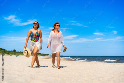 Two beautiful middle aged females walking on white sandy beach in summertime. Front view