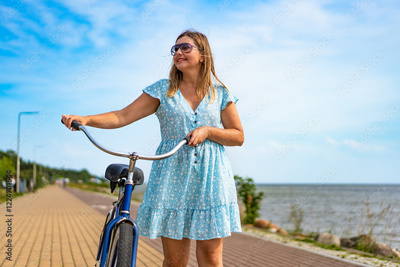 Summertime activity. Beautiful mature woman wearing summer dress walking with cruiser bike on bicycle path on seafront on sunny day. Front view