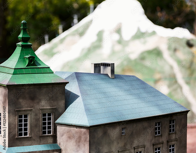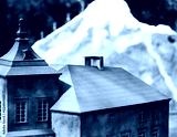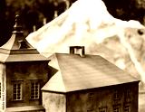 image of the wall and roof of an old castle on a background of snow-capped mountains