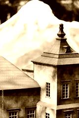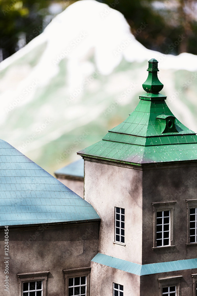 image of the wall and roof of an old castle on a background of snow-capped mountains