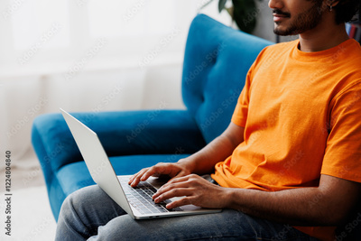 Young IT Indian man wear orange casual clothes sit on blue sofa couch work hold use laptop pc computer stay at home hotel flat rest relax spend free spare time in living room indoor. Lounge concept.