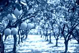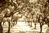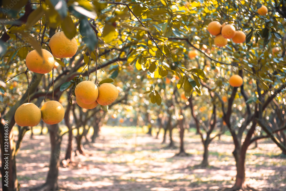 Close-up ripe yellow grapefruit with blurry row of abundant trees Asian pomelos ready to harvest in Hanoi, hanging Dien citrus heirloom fruits branch homegrown backyard organic farming garden