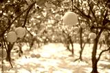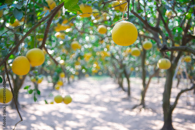 Selective focus ripe yellow grapefruit with blurry row of abundant trees Asian pomelos ready to harvest in Hanoi, hanging Dien citrus heirloom fruits branch backyard organic farm garden sunny