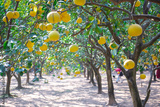 Motion blurry people harvesting ripe grapefruit selective focus row of abundant trees load of ripe yellow pomelos in Hanoi, hanging Dien citrus grapefruit fruits backyard organic farm garden