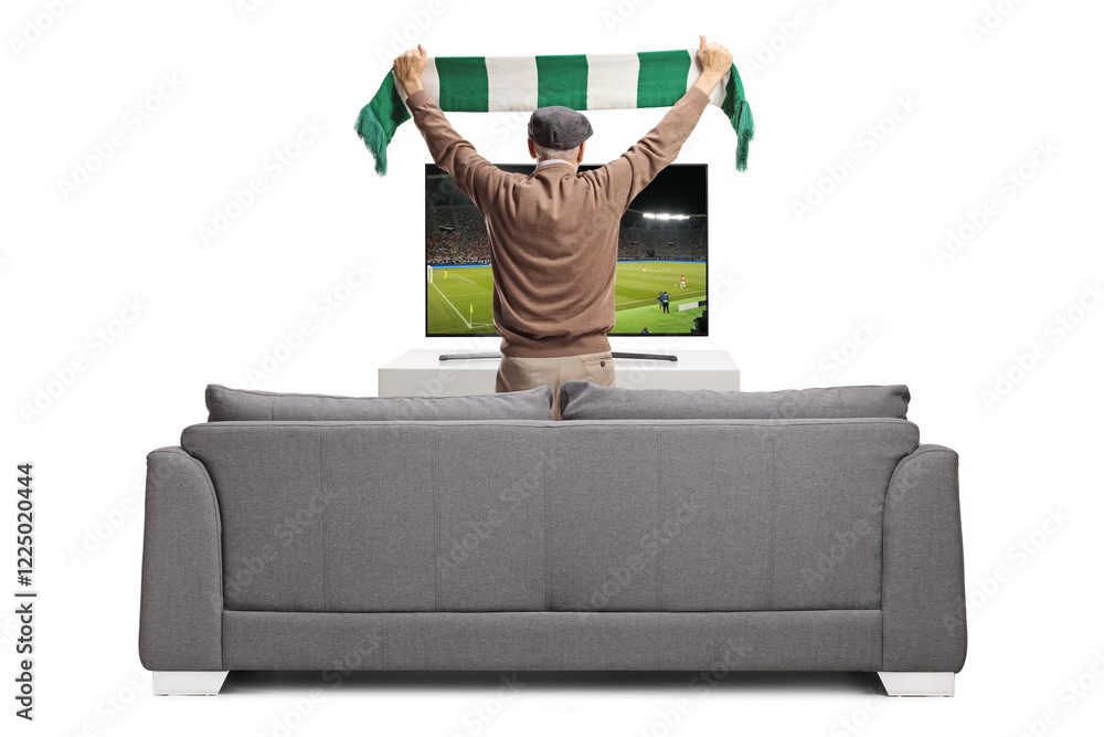 Rear view shot of an elderly man cheering with a green and white scarf and watching football on tv