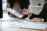 Business team two colleagues discussing new plan financial graph data on office table with laptop and digital tablet.