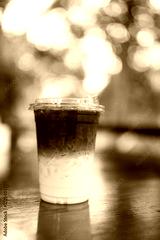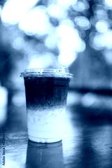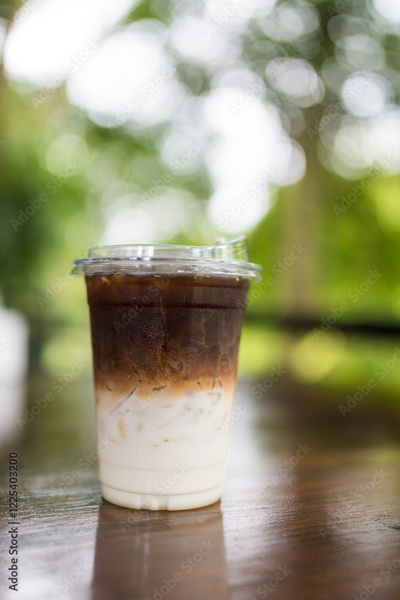 White and black coffee layers, Ice latte coffee in a glass on wood table with copy space.