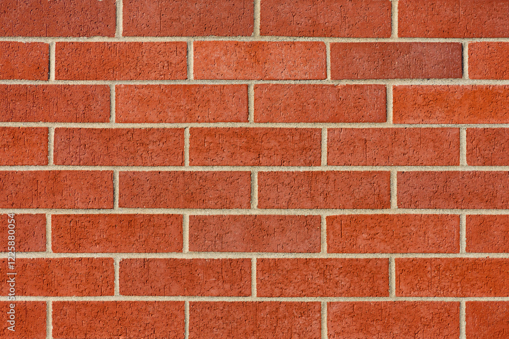 An abstract image of a rectangular red brick exterior wall with a rough texture and varying shades of red ranging from light to dark.