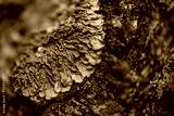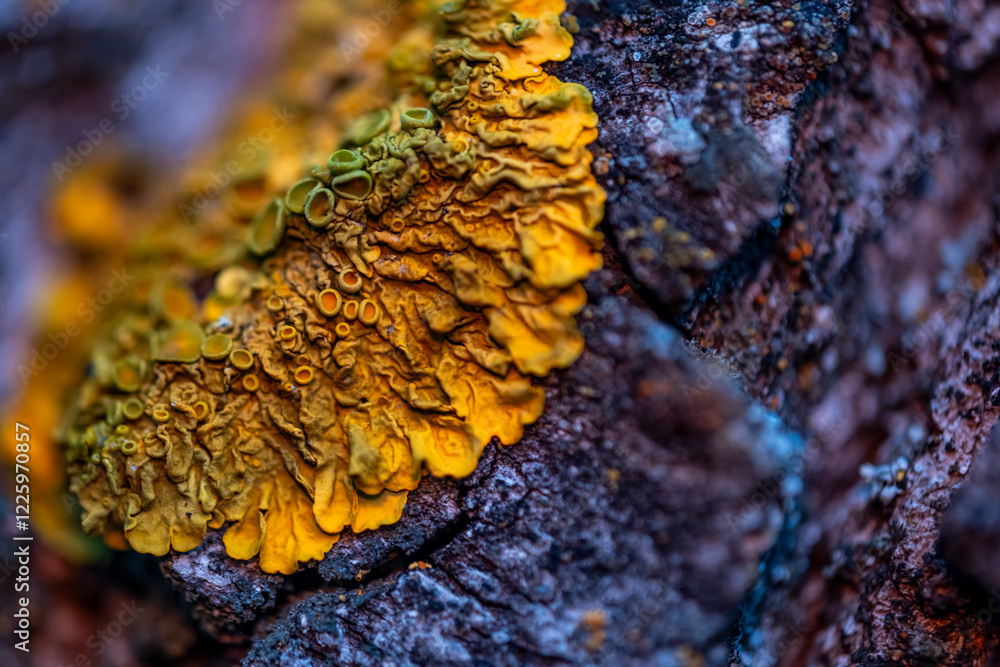 A close up of a tree branch with a yellow and green moss growing on it