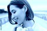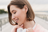 Close up portrait of a fit young beautiful woman girl female jogger listening to the music in headphones during running in the city in the morning. Athlete preparing for jogging in earphones outdoors.