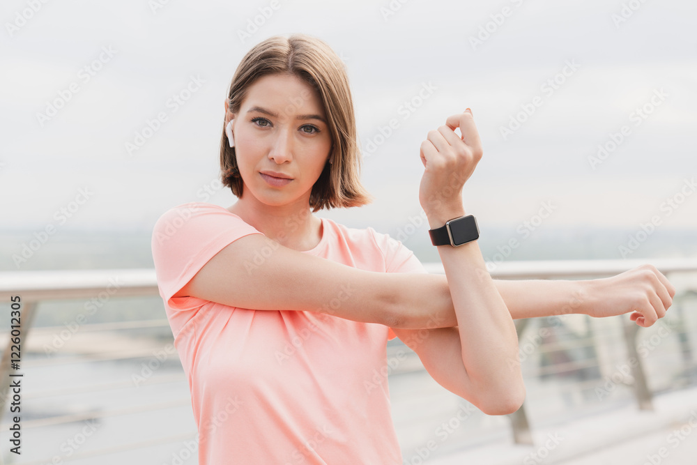 Cropped portrait of a caucasian young female athlete sportswoman looking at the camera wearing fitness clothes stretching her arms doing warming-up exercises before jogging workout outside.