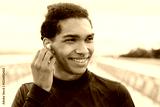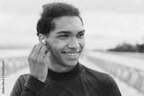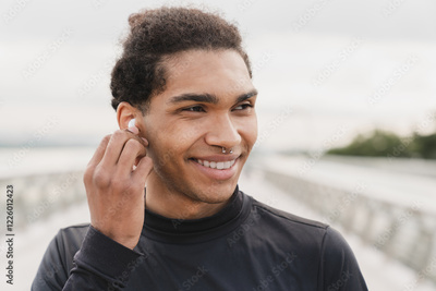 Young african male athlete in sportive outfit listening to his favorite song music soundtrack playlist in earbuds running outdoors. Healthy active lifestyle concept
