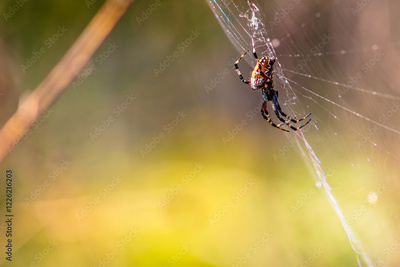 Spotted garden spider (Neoscona oaxacensis) on its web in a forest, in the Sierra de Guadalupe, Mexico State