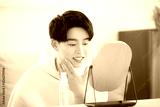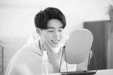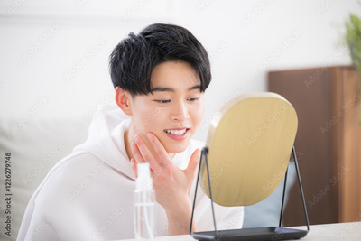 鏡を見る髭脱毛やスキンケアのイメージ 若い20代笑顔男性