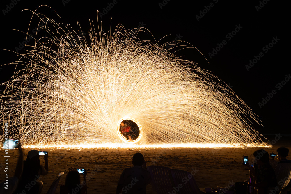 Swing fire dancing show, long exposure on the floor at the night time in the beach at Thailand