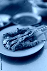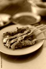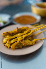 Satay Pork marinated with yellow spices, dressed on a skewer, grilled until cooked eaten with peanut sauce and cucumber with shallot sweet sour sauce