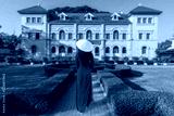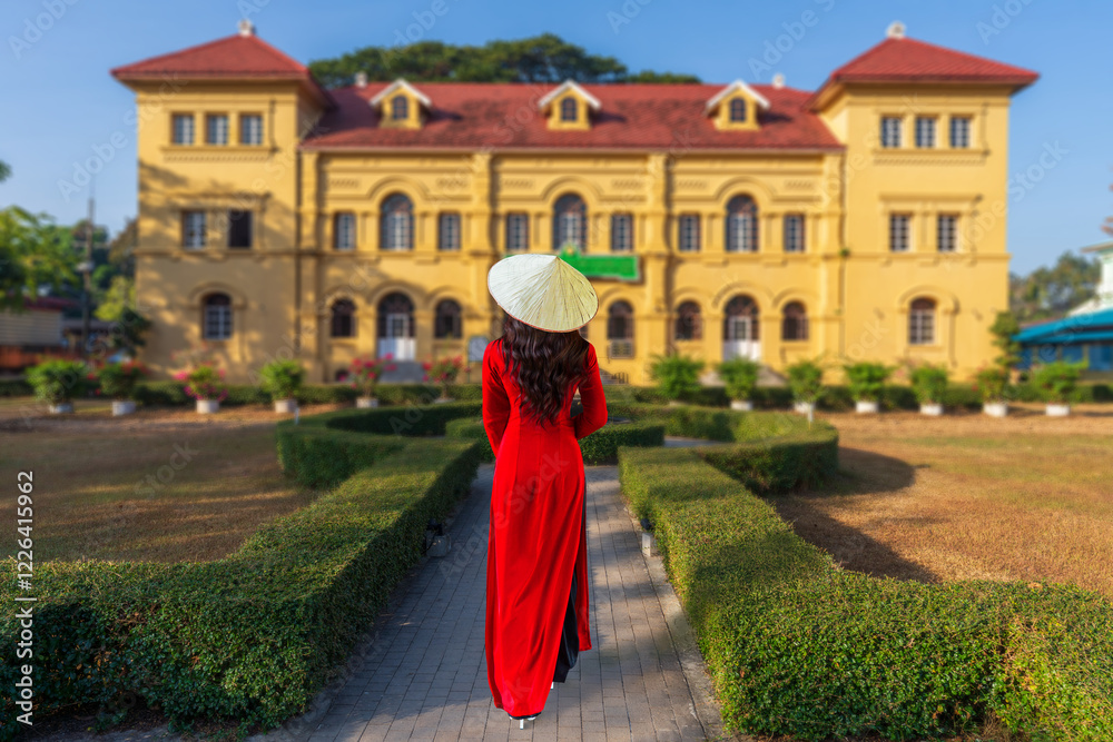 A young Vietnamese tourist in a red national costume visits the old library in Nakhon Phanom Province, Thailand.