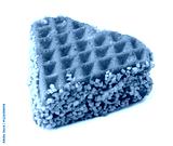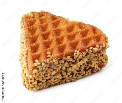 Triangular waffle coated with nuts resting on a white background, perfect for dessert lovers